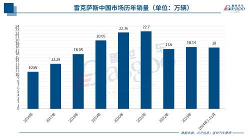 从雷克萨斯近年来的销量趋势来看,其在中国市场的表现曾一度非常强劲。2016年,雷克萨斯在华销量首次突破10万辆大关,四年后的2021年,销量成功翻番,达到22.7万辆,创造了历史巅峰。然而,2022年销量出现大幅下滑,同比下降24.5%。2023年销量回升至18.1万辆,2024年前11个月也保持了18万辆的销量和21%的同比增长率。