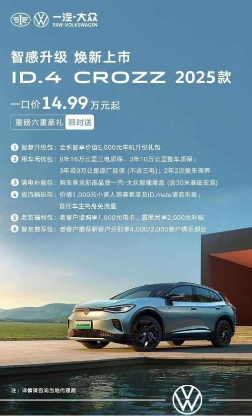 日前,车质网从官方获悉,2025款一汽-大众ID.4 CROZZ正式上市,新车推出4款车型,售价区间19.49-29.86万元。新车还推出了限时一口价,其中纯享版一口价为14.99万元,长续航PURE+版限时一口价为18.59万元。
