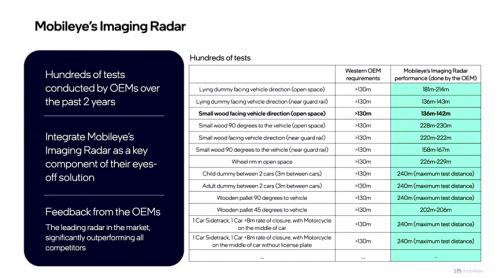 除了上述高分辨率和大动态范围,其远距离检测精度也令人印象深刻。面对多种危险物检测场景,如面向车辆方向的假人、与车辆呈90°的小木块、两辆车之间的儿童及成人的假人等,西方主机厂设定的检测距离要求均为大于130米。而Mobileye成像雷达在某主机厂的实际测试中,在多数场景下的检测距离远超此要求,其中最低检测距离136米亦高于该标准。这对为高速行驶的自动驾驶车辆提供了充足的安全预警距离十分有意义。
