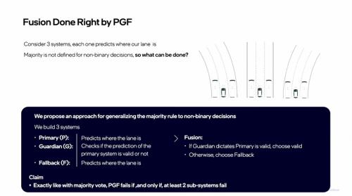 Mobileye独特的系统设计原则以及多维度冗余来源布局已然为系统的可靠性奠定了坚实基础。然而,如何将这些冗余组件高效整合并使其在复杂的自动驾驶场景中精准协同运作,成为了进一步提升系统性能的关键所在。为此,Mobileye提出了主系统-监护系统-备用系统(Primary - Guardian - Fallback,PGF)创新融合方法,它作为Mobileye冗余体系中的核心协调机制,在实现多源信息的智能融合与保障系统持续稳定运行方面发挥着重要作用。