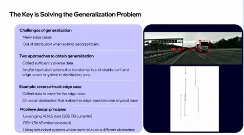 Shashua教授认为实现高精确度和高召回率的关键在于有效攻克泛化问题。泛化问题主要源于两个方面的挑战:一是众多的边缘情况:在实际驾驶中,可能会出现突然闯入道路的动物、道路上的临时障碍物、非标准的交通标志等意外情况,这些边缘情况若不能妥善处理,将严重影响系统的准确性和可靠性;二是地理扩展时的分布外情况:由于不同地区的地理环境、交通规则和文化习惯存在差异,当系统从一个地区推广到另一个地区时,可能会遭遇数据不适用的问题,导致系统性能下降。