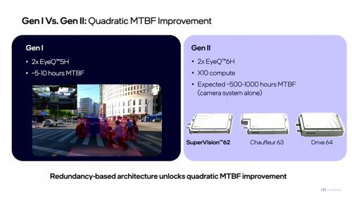EyeQ™ 6芯片的高效率对MTBF的提升也起到了关键的作用。通过Shashua教授的展示,可以得知,搭载两块EyeQ™ 5H芯片的第一代产品(GenⅠ),MTBF仅为5至10个小时,而基于冗余架构并搭载两块EyeQ™ 6H芯片的第二代产品(Gen II),仅在摄像头系统上,MTBF就暴增至500至1000个小时。也就是说,EyeQ™ 6H的算力是上一代的10倍,但由于冗余设计的加持,10倍算力可以转化为MTBF的100倍。