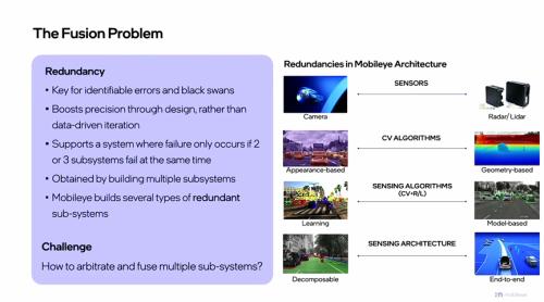 为解决该问题,Mobileye也提出了一系列创新思路。Shashua教授强调, Mobileye在系统设计之初就将冗余设计作为核心考量,通过精心的架构设计,从源头上提升了系统的精度和可靠性,而非被动地依赖数据驱动迭代。此外Mobileye规定系统只有在两个及以上的子系统同时出现故障时才会失效,这使得系统的容错能力得到了显著增强。