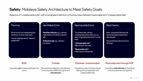 在Mobileye提出的安全架构下,有四类错误需要规避和应对,即规划类错误(planning),可复制型错误(reproducible errors),可识别型错误(identifiable errors),以及“黑天鹅”事件(black swans)。而冗余系统对于处理后两类错误至关重要。