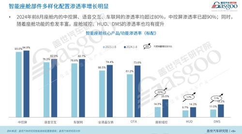 根据盖世汽车研究院《智能座舱产业报告》,智能座舱部件多样化配置渗透率增长明显,2024年前8月座舱内的中控屏、语音交互、车联网的渗透率均超过80%,中控屏渗透率已超90%;同时,随着座舱功能的愈发丰富,座舱域控、HUD、DMS的渗透率也均有提升。