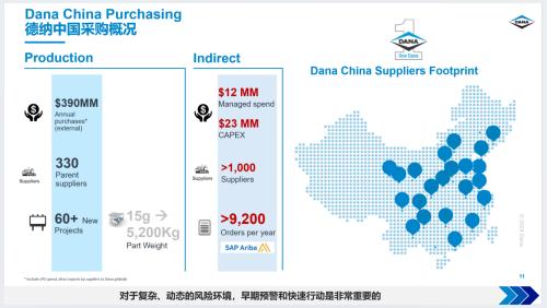 首先我们四个事业部,每个单一的品类都是跨事业部集中的模式,我们同时又在一些有成本优势的国家,在屏幕上的中国、韩国、印度、墨西哥以及东欧都有自己的国际采购办公室,自己内部的简称叫IPO,是我们国际采购办公室。我们通过这样的一些全世界各地的循原和比较,通过单一品类集中的管理,确保德纳一个声音对待一个供应商和一个品类,我们去做跨事业部的一决策。我们任何供应商的定点,任何项目的定点都是跨事业部以及同一个品类以一个德纳的战略布局和定点的,这是我们直接材料的采购。