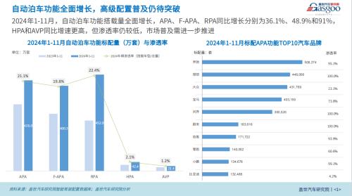 自动泊车市场呈现出全面增长的态势,但高级配置的普及仍待突破。2024年1-11月,APA、F-APA、RPA的搭载量均有大幅提升:APA搭载量达426万套,同比增长36.1%;F-APA搭载量为400.3万套,同比增长48.9%;RPA搭载量更是高达452.9万套,同比激增91%。尽管HPA与AVP两大高阶功能的搭载量也有所增加,分别达到42.4万套和23.4万套,但其市场渗透率仍较低,分别为2.1%和1.2%。在此期间,标配APA功能的TOP10汽车品牌涵盖了奔驰、理想、大众、宝马、问界、蔚来、极氪、零跑、小鹏、比亚迪等知名品牌。