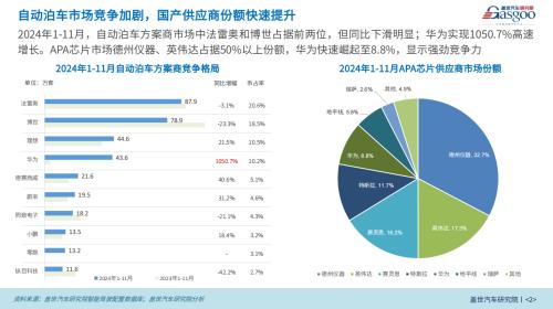 自动泊车市场竞争日益激烈,国产供应商正迅速扩大其市场份额。2024年1-11月,尽管法雷奥和博世仍位居自动泊车方案商市场前两位,但它们的市场份额同比出现显著下滑,法雷奥下滑3.1%,博世更是下滑了23.3%。与此同时,华为以惊人的1050.7%增速领跑市场,德赛西威也实现了40.6%的增长,展现出强大的市场竞争力和广阔的发展潜力。在APA芯片市场,德州仪器、英伟达和赛灵思依然保持较大市场份额,但华为作为国产力量迅速崛起,已占据8.8%的市场份额,预示着国产供应商在该领域的强劲势头。