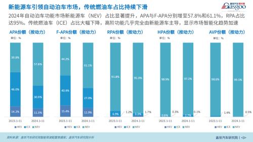 新能源车已成为自动泊车市场的主导力量,而传统燃油车的占比则在持续下滑。从2023年1-11月到2024年1-11月的数据对比中,可以清晰地看到这一趋势。APA在新能源车上的搭载率从39.8%显著提升至57.8%,而在传统燃油车上的搭载率则从46%下降至30.9%。F-APA在新能源车上的搭载率也从44.2%提升至61.1%,而在传统燃油车上的搭载率则下降至27%。值得注意的是,HPA和AVP等高阶自动泊车功能几乎完全由新能源车所主导。在2024年1-11月期间,HPA和AVP的新能源车占比分别高达97.2%和99.5%,进一步凸显了新能源车在智能驾驶技术领域的领先优势。