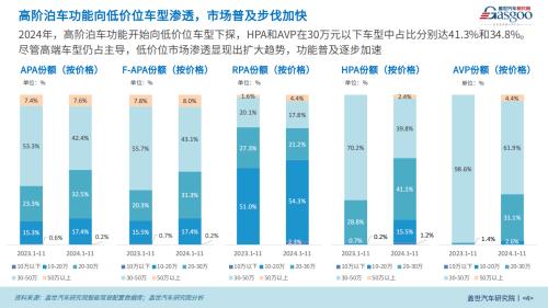 高阶泊车功能正加速向低价位车型渗透,市场普及步伐显著加快。从2023年1-11月到2024年1-11月的数据对比中,在30万元以下车型市场中,APA的渗透率从39.2%大幅提升至50.1%,F-APA的渗透率也从36.5%提高至48.9%。同时,HPA的渗透率从29.7%显著上升至57.8%,AVP的渗透率更是从1.4%猛增至33.7%。值得注意的是,AVP功能下探至10-20万车型。尽管高端车型目前仍占据主导地位,但低价位市场的渗透趋势已愈发明显,显示出高阶泊车功能正逐步普及,为消费者带来更多智能便捷的驾驶体验。