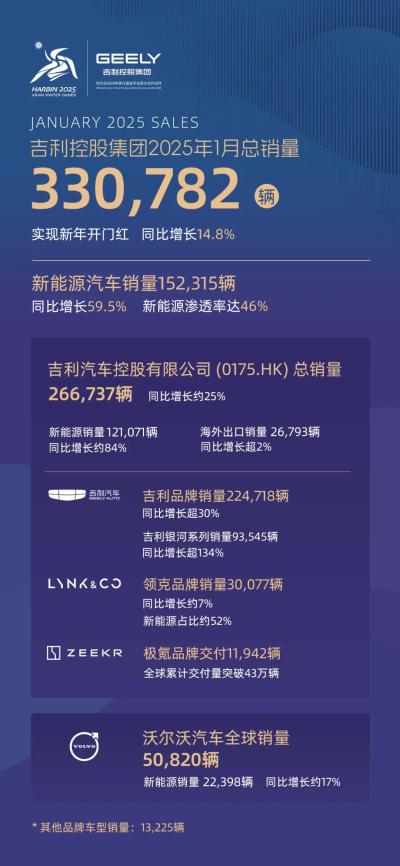 油车逆势增长,新能源产品持续热销 拆解控股集团销量构成可以发现,1月吉利汽车控股有限公司销量266,737辆,同比增长约25%,再创单月销量历史新高。其中,新能源1月销量(含吉利品牌、领克品牌、极氪品牌)121,071辆,同比增长约84%,环比增长约9%,销量占比突破45%。 在吉利汽车超26万辆的销量中,吉利品牌销量为224,718辆,同比增长超30%;领克品牌1月销量为30,077辆,同比增长约7%;极氪品牌1月交付11,942辆。 吉利汽车单月销量创历史新高与其主流新能源品牌吉利银河的畅销不无关系。数据显示,2025年1月,吉利银河多款车型延续爆款趋势,当月销量达到93,545辆,同比增长超134%,环比增约35%。 例如,银河星舰7 EM-i持续刷新A级电混SUV最快交付记录,2025年1月销量达20,330台,上市48天交付破3万;吉利银河E5当月销量14,734辆,1月29日第十万辆吉利银河E5正式下线,标志着吉利银河迈入崭新的里程碑;吉利星愿新年首月销量28,147辆,连续三周蝉联全品牌A0级纯电车型销量冠军,上市至今累计销量突破8万辆。 油车的逆势增长也成为吉利汽车月销量创新高的重要砝码。数据显示,1月,“中国星”系列销量攀升迅猛,当月共计销量53,813辆,环比大增约33%,旗下星瑞和星越L分别稳居中国品牌A级燃油轿车、全品牌燃油SUV销量榜第一。 另外,沃尔沃汽车1月全球销量50,820辆,其中新能源汽车销量为22,398辆,同比增长约17%,品牌电气化进程持续加速。在其1月新能源汽车销量中,纯电动车型同比增长5%至9,705辆,占比19%;插电式混合动力车型全球销量为12,693辆,同比增长28%。 内销跃升第一,2025年多能源路线齐发力 2025年1月,吉利汽车海外出口销量26,793辆,环比超9%,同比增长2%。 在海外渠道建设方面,吉利今年将增加300多个销售及服务网点,进一步提升海外渠道覆盖和售后保障能力。同时,吉利将加速推进KD制造布局,在印尼、越南、中亚、非洲等多个国家推进KD本地化制造,有效提高全链成本竞争力。 值得一提的是,剔除海外销量后,吉利汽车1月国内销量为239,944辆,成为“内销王”。紧随其后的比亚迪同期国内销量为234,202辆。1月,比亚迪总销量为300,538辆,其中海外销量达到6.6万辆。 从上述两家车企在开年首月的市场较量不难发现,2025年的汽车行业竞争将会愈发激烈。 面对全球经济新形势和行业竞争新格局,吉利控股于去年9月发布《台州宣言》,通过“战略聚焦、战略整合、战略协同、战略稳健、战略人才”五大举措,聚焦汽车主业、布局科技生态、提升竞争力、稳中求进。 在《台州宣言》战略指引下,吉利汽车乘用车版块将形成吉利汽车集团和极氪科技集团,两大汽车业务主体的“两横”布局。其中,吉利汽车集团整合吉利、吉利银河、雷达、翼真等,面向大众主流市场,加速新能源转型;极氪科技集团整合领克、极氪,组建全球领先的高端豪华新能源汽车集团。 出于对战略转型全新阶段的长期信心,吉利乘用车版块将2025年销量目标定为271万辆,较2024年总销量增长约25%。其中,吉利汽车集团目标200万辆,吉利银河挑战年销100万辆,同时持续挖掘海外市场全新增长点,力争2025年实现海外市场15.6%以上增长;极氪科技集团目标71万辆,未来两年将成为年产销百万级、全球领先的高端豪华新能源汽车集团。2025年,吉利乘用车新能源销量目标为150万辆。 据了解,为了实现上述目标,在新产品推进方面,吉利银河计划推出5款全新产品,包括2款SUV、3款轿车,每一款都是主流细分市场的核心产品,力求做到上市即上量。 1月17日,定位于“2L级国民精品家轿”的吉利银河L6 EM-i正式开启预售,推出60km启航版/探索版和140km远航版/探索+版/星舰版共五个版型,官方预售先享提车价8.98万元-11.68万元。另作为“3L家庭精品SUV”新选择的全新银河L7 EM-i在吉利银河冰雪乐园正式亮相,新车为更加注重能耗的用户量身打造,实现3L级亏电油耗。 领克品牌方面,1月3日,领克大型高端电混SUV领克900首发亮相,该车基于SPA Evo架构打造,将成为大型豪华旗舰电混SUV典范。极氪则在1月9日发布旗下第二款猎装车极氪007 GT,新车融合豪华与性能,计划于今年第二季度上市。 另外,为了满足不同地区用户的多样化出行需求,吉利一直坚持多能源路线发展。 在新型能源领域,吉利深耕甲醇领域20年,成功攻克甲醇腐蚀、溶胀、耐久和冷启动四大行业难题,探索出一条长期可持续发展的甲醇汽车路径。据悉,吉利自研的第五代超醇电混技术可实现甲醇和汽油两种燃料在同一油箱内的灵活配比,采用了全球首创的甲醇发动机,发动机热效率达到了全球最高的48.15%,并且突破性地实现甲醇燃料在零下35℃低温下的启动。 就在今天(2月7日),第9届亚冬会在哈尔滨正式开幕,吉利控股集团作为官方合作伙伴,向组委会提供了350辆醇氢电动汽车,为亚冬会超低温环境用车提供安全、绿色、高效解决方案。今年,吉利还将推出搭载全新一代“超醇电混”技术的全新轿车与全新SUV。