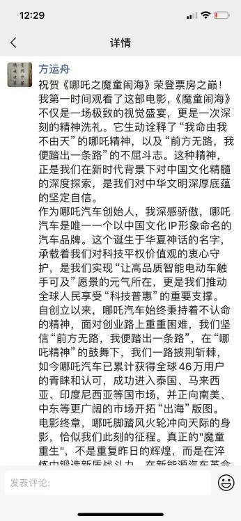 2024年6月,周鸿祎发起的哪吒要不要改名,最终创始人方运舟官方回应不改名。而在最新的朋友圈中,方运舟也在回应哪吒2电影的成功。他说:作为哪吒汽车创始人,我深感骄傲,哪吒汽车是唯一一个以中国文化IP形象命名的汽车品牌。这个诞生于华夏神话的名字,承载着我们对科技平权价值观的衷心守护,是我们实现“让高品质智能电动车触手可及”愿景的元气所在,更是我们推动全球人民享受“科技普惠”的重要支撑。