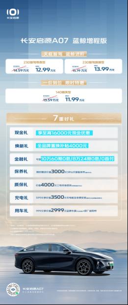 智驾平权,蓝鲸进阶。在智慧新蓝鲸3.0的全面赋能下,长安启源A07蓝鲸系列车型将重塑新能源轿车市场格局,让更多消费者享受到智能科技带来的便捷与安全。未来,长安启源将继续在续航、补能和智驾等核心技术领域持续创新,以更智能、更环保、更高效的产品为消费者带来更加从容的出行体验。