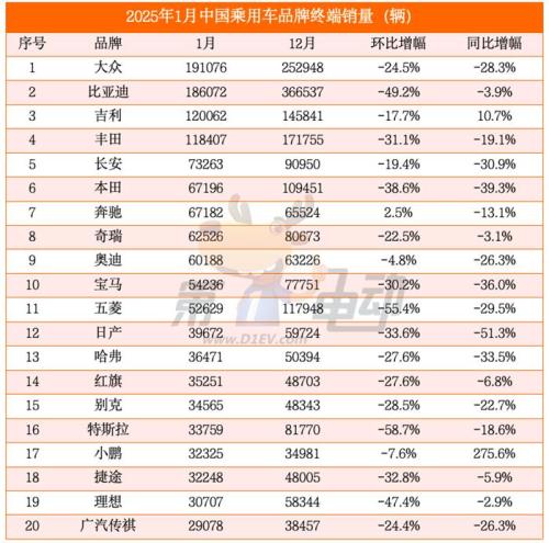 ▍大众再超比亚迪夺冠!小鹏、吉利同比逆势大涨