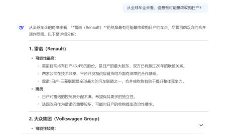 但Deep Seek认为,日产和雷诺之间或许仍存在如日产和本田的控制权分配问题,日产希望保持更多的独立性。此外,两大跨国企业收购,或许还将面临国际贸易审查等问题。