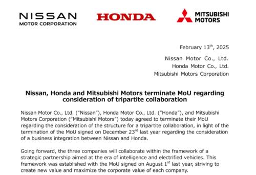 2月13日,本田和日产宣布解除于2024年12月23日签署的经营整合协商基本意向书,并终止经营整合协商。未来,双方将在面向汽车智能化和电动化的战略合作伙伴框架内开展合作,实现各自企业价值的最大化。