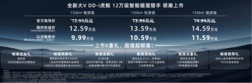 2月28日,启辰全新大V DD-i虎鲸以“12万级最强智能插混猎手”的身份正式上市,限时权益价12.59万元起,以旧换新价更是低至9.99万元起。同时从现金膨胀、增换购补贴到终身质保,主打“买车无压力,用车更经济”。