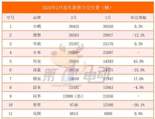 而问界、智界、深蓝等车型销量环比出现下滑。其中,问界销量下滑至12000辆左右,与1月相比几近腰斩;智界销量环比大降超30%;深蓝增速放缓并出现下滑趋势,2月销量环比大降24%,排名降至第六。