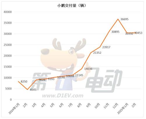 2月小鹏汽车共交付新车30,453台,同比增长570%,连续4个月交付量突破30,000台,连续2月超越小鹏夺冠。其中,小鹏MONA M03连续3个月交付超15,000台,小鹏P7+上市3个月,累计交付超30,000台。2025年1月-2月,小鹏汽车累计交付新车共60,803台,同比增长375%。