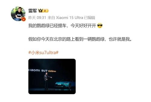 近日,小米集团创始人、CEO雷军在社交平台发布已提SU7 Ultra,并表示“假如你今天在北京的路上看到一辆鹦鹉绿,也许就是我。”看的出来,随着SU7 Ultra上市大获成功,同时小米股票股价也是节节上涨,雷军的心情也是大好。