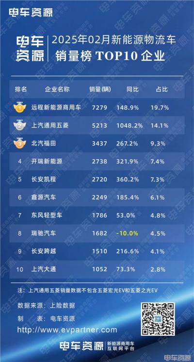今年新能源物流车销量2月份较1月份迎来暴涨,TOP10企业中,有7家车企实现了销量同比三位数以上的增长。