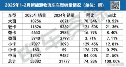 据电车资源统计,2025年2月,我国新能源物流车总销量为37031辆(不含物流重卡、皮卡),同比增长173%。1-2月,新能源物流车累计销量55382辆,同比增长74.82%,呈现出“1月平稳奠基、2月爆发式增长”的特征。