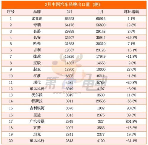 2月,比亚迪出口量连续2个月突破6万辆,超越奇瑞品牌,再创历史新高,再次跻身中国汽车品牌出口量榜榜首。