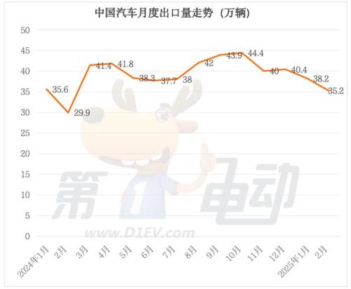 乘联会数据显示,2025年2月中国汽车出口量达到35.2万辆,环比下降7.8%,同比上涨17.5%。其中,新能源车出口量为11.8万辆,环比下滑15.1%,同比大涨52.7%;纯电动车出口量为6.9万辆,环比下滑25.2%,同比下降10.2%;插电式混合动力车出口量为4.5万辆,环比上涨1.3%,同比暴涨229.4%。