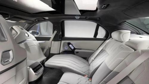 从下图可以看到,为了放下这块后排屏幕,宝马取消了可开启的全景天窗,并对遮阳帘的导轨做了一些调整。