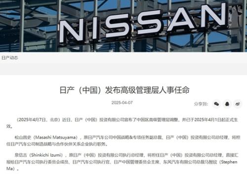 原日产(中国)投资有限公司执行总经理泉信吉,将担任日产(中国)投资有限公司总经理,以上任命已于2025年4月1日起正式生效。