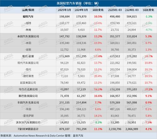 美国从4月3日起对所有进口汽车和轻型卡车加征25%关税的政策,预计将在未来几周和几个月内推高车辆批发价格和零售价格。有迹象表明消费者正密切关注美国关税的影响,并纷纷赶在关税生效之前购买汽车,这推动福特汽车、现代汽车和起亚今年3月份在美国的零售销量分别同比增长19%、15%和25%。