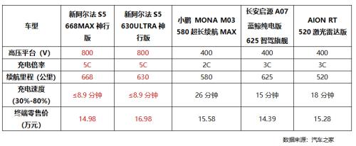 值得一提的是,新阿尔法S5神行版还一次推出了两款车型,续航分别是668公里和630公里,全部在600公里以上,让用户续航长和超闪充,不做选择题。而且新阿尔法S5神行版14.98万的起售价,让5C很香,继续不贵。