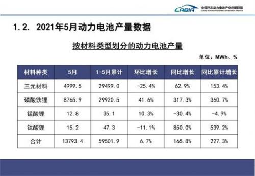 而就在近日,据动力电池产业创新联盟发布2021年5月动力电池月度数据显示,磷酸铁锂电池产量达到了8.8GWh,占总产量63.6%,同比增长317.3%。而今年1-5月,磷酸铁锂电池累计产量达到29.9GWh,占总产量50.3%,同比累计增长360.7%。