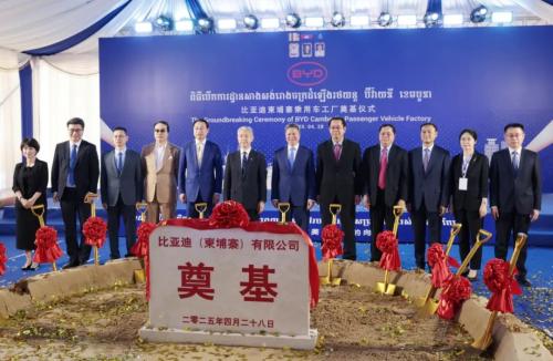 4月28日,西哈努克港经济特区内,比亚迪柬埔寨乘用车工厂奠基仪式隆重举行。柬埔寨副首相兼发展理事会第一副主席孙占托、中国驻柬埔寨王国特命全权大使汪文斌及西哈努克省省长蒙西纳等中柬两国重要领导人出席仪式。