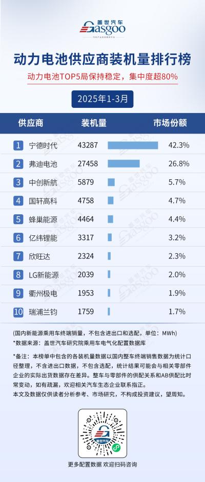 动力电池供应商装机量排行榜:TOP5格局稳固,行业集中度突破80%临界点