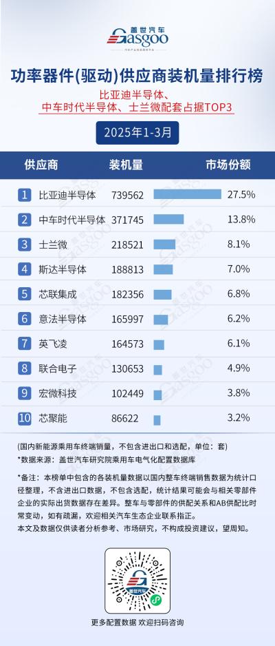 根据榜单数据来看,功率器件(驱动)供应商装机量排行榜呈现显著的三足鼎立格局。榜单显示,比亚迪半导体、中车时代半导体、士兰微三家本土企业合计占据49.4%市场份额,标志着在汽车功率器件领域,国产替代已形成战略突破。