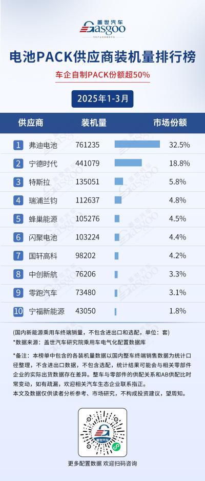 电池PACK供应商装机量排行榜:车企自制PACK主导市场格局