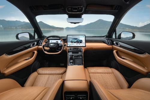 内饰设计灵感同样来源于山河之中的天然肌理。大气舒展的环抱式座舱,如展开的卷轴般自在延伸;细节处,水岸涟漪*副仪表台将灵动水波凝练为精致纹理,匹配具备50个切割面的晶钻挡把,以及木纹、金属饰件、大面积“科技豪华感”皮革,触手可及皆显轻奢质感。