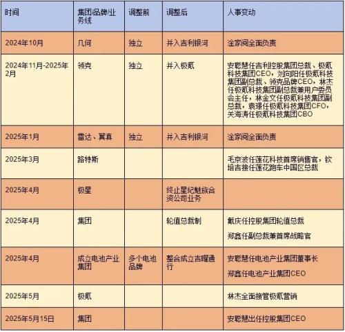 造车是一场马拉松,造车企业更应该以百年公司为筹划长远。在这一漫长的发展过程中,外部环境的变化和自身成长的变化是两条关键线,企业越是壮大,调整所需的魄力和外界看来的动作就越剧烈。自台州宣言发布以来,吉利已经进行了数轮调整,涵盖品牌整合、业务线整合、人事变动等,中国经济网统计制表如下: