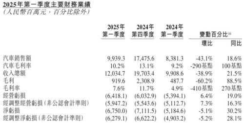 而同日稍早发布的2025年第一季度财报显示,蔚来距离达成以上目标仍需努力。第一季度,蔚来总营收为120.347亿元,同比增长21.5%、环比下降38.9%;毛利为9.196亿元,同比增长88.5%、环比下降60.2%;毛利率为7.6%,同期为4.9%、2024年四季度为11.7%。其中,汽车销售额99.393亿元,同比提升18.6%、环比下降43.1%;汽车毛利率重回两位数,为10.2%。一季度,蔚来经营亏损64.181亿元,同比增长19.0%、环比增长6.4%。净亏损67.500亿元,同比增长30.2%、环比下降5.1%。销量方面,一季度,蔚来交付新车42094辆,同比增长超40%