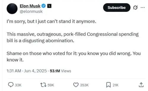 马斯克认为,法案“不仅没有削减、反而进一步扩大了预算赤字,它破坏了政府效率部正在做的工作”。