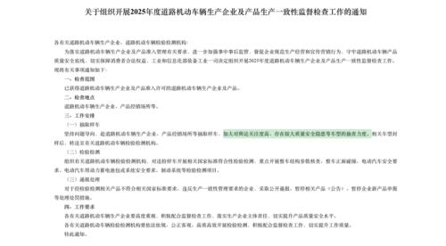 而在打出禁止恶性竞争和整治车企供应商账期问题的组合拳后,国家近日再次重拳出击,发布《关于组织开展2025年度道路机动车辆生产企业及产品生产一致性监督检查工作的通知》(下文统称《通知》),将重点聚焦在车辆安全问题上,引发市场的强烈关注。