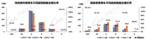 分燃料类型来看,1-5月,传统燃料乘用车中,A级、B级及C级销量有所下降。其中,销量最为集中的A级车累计销量同比下降10.1%,为306.8万辆。