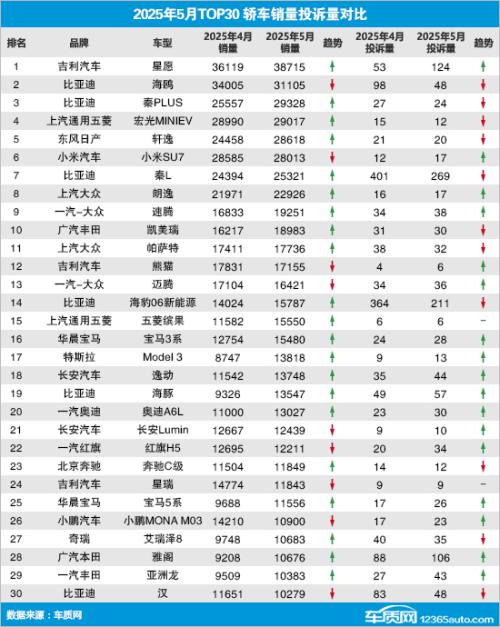 据乘联会提供的全国汽车产销数据显示,2025年5月份国内轿车市场累计零售销量87.1万辆,环比上涨6.1%,同比上涨10.7%。同期,车质网受理车主针对轿车的有效投诉7,882宗,环比下降3.3%,同比上涨9.6%。去除投诉人自愿申请撤诉的信息后,2025年5月TOP30轿车销量投诉量排名如下:
