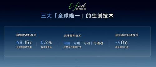 除了EM-P和EM-i外,雷神动力此次还宣布了一位“新伙伴”——雷神醇氢E-fuel。凭借三大「全球唯一」的独创技术,雷神醇氢E-Fuel现了卓越的性能与环保优势。