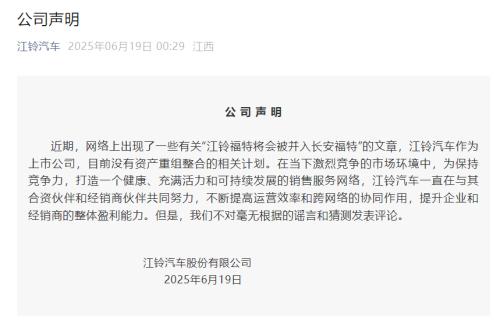 6月19日凌晨,江铃汽车通过其官方公众号发布声明,就日前“江铃福特并入长安福特”传闻进行回应。
