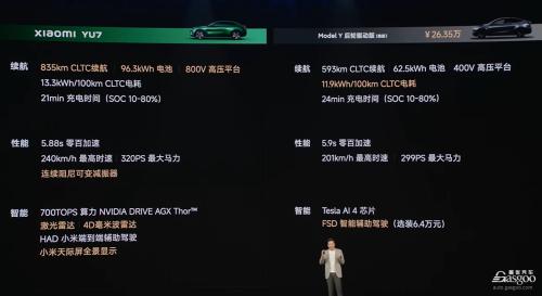 在发布会上,小米集团创始人、董事长兼CEO雷军拿小米YU7与Model Y进行了各项数据对比,并称在多项数据领先的情况下,小米YU7标准版比Model Y后轮驱动版还便宜一万元。
