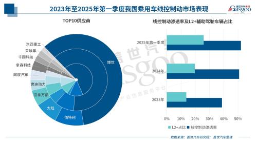 由此,根据盖世汽车研究院数据显示,近年来国内供应商在线控制动TOP10榜单中已稳占六席,其中2025年第一季度中,合计市场份额达24.27%。
