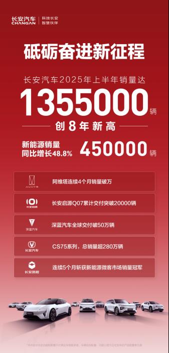 7月1日,长安汽车发布2025年上半年成绩单:半年累计销量135.5万辆,创近8年新高,展现出央企代表的“硬核”实力。其中,新能源强势攀升,半年销量达45万辆,同比增长48.8%;智能化开启“北斗天枢2.0”计划新征程,“四大数智升级”擎画未来数智出行新蓝图;全球化布局加速落地,首个海外新能源工厂投产,产业出海初见成效。长安汽车凭借清晰的战略规划与创新技术驱动,全面迎来转型收获期,迸发出强劲的增长势能与可持续发展的深厚潜力。