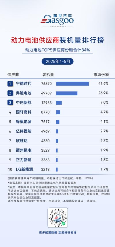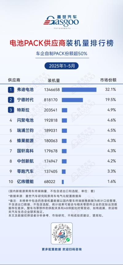 电池PACK供应商装机量排行榜(2025年1-5月)